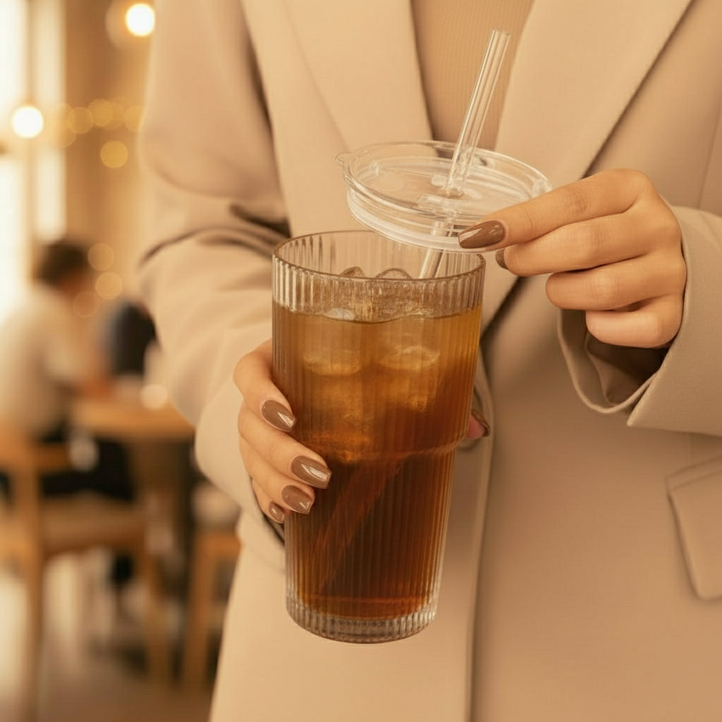 Son couvercle ajusté et sa paille en verre vous permettent de savourer proprement, confortablement, partout :